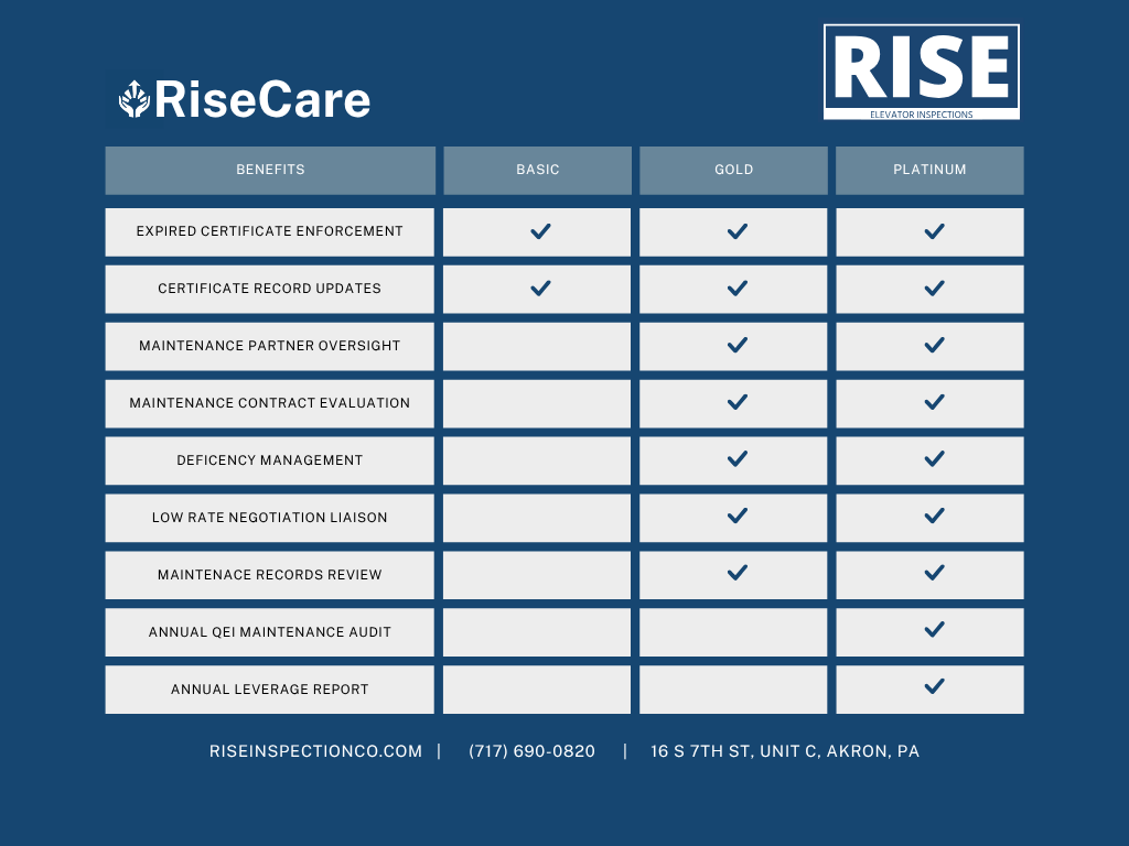 RiseCare is Rise Inspection Services’ exclusive suite of elevator compliance and maintenance management solutions, designed to take the stress and guesswork out of elevator ownership. Whether you manage a single property or a portfolio across the nation, RiseCare ensures your elevators remain safe, compliant, and cost-effective—year after year.